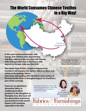 In this post-covid environment, with energy and material costs skyrocketing and duty adding to the cost, how will Chinese mills and exporters fare in the future with exports to Europe, India and the USA? The winter issue of F&FI, (timed to Heimtextil in Frankfurt) will examine the factors affecting China as it relates to furnishings fabrics. Interviews with leading mill...